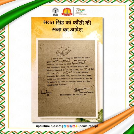 महान क्रांतिकारी भगत सिंह जी को फाँसी की सजा के आदेश की प्रति